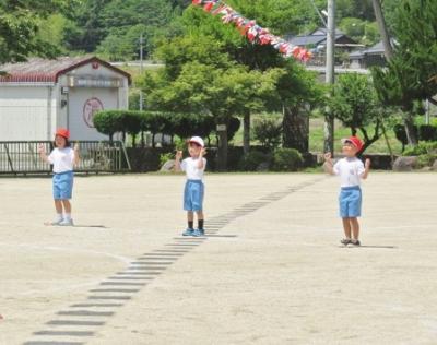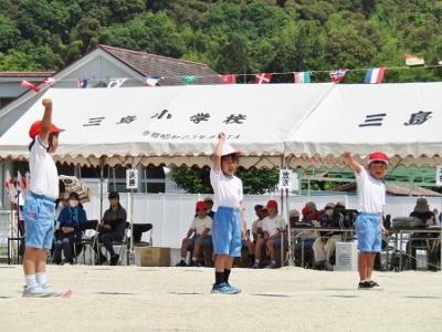 1年生が、かわいらしい動作で保護者や地域のみなさんに後片付けなどのお願いをしました。