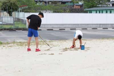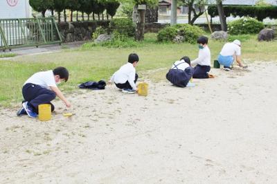 昨日のお昼の掃除は、全校児童がグラウンドの草引きをしました。時間いっぱい黙々と草引きをしている三島っ子の姿が見られました。