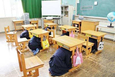 2023年4月18日 07時00分先日、地震を想定した避難訓練を行いました。子どもたちは、地震発生を知らせる校内放送とともに、「だんごむしのポーズ」で机の下に身を隠し、その後、校舎前へと避難しました。また、避難するときの合言葉「お(押さない)・は(走らない)・し(しゃべらない)・も(戻らない)・ち(近寄らない)」を守って、真剣な態度で参加していました。