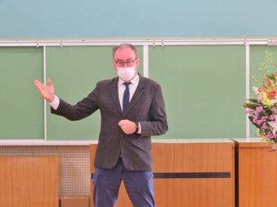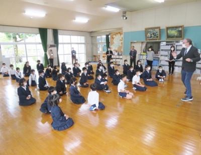 初めて三島小学校に来られたALTの先生の紹介式を行いました。紹介式では、J先生が自己紹介をしたり、全員で手遊び歌をしたりして楽しみました。