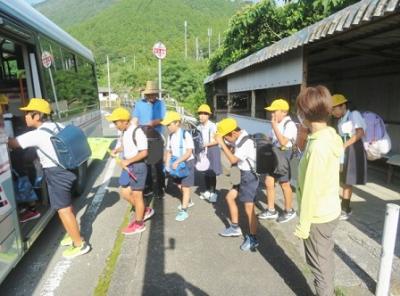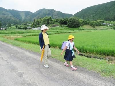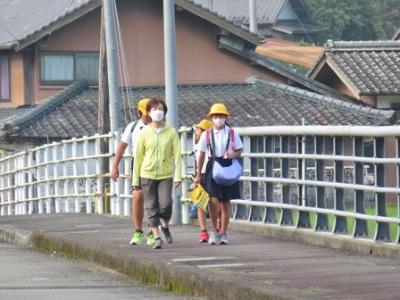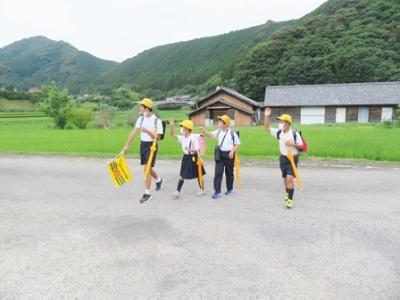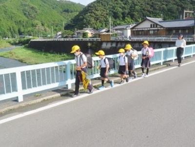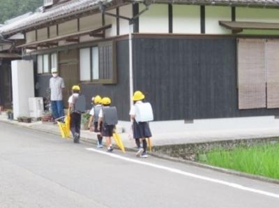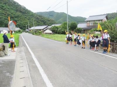 登校の様子 2023年7月17日 11時27分 いつも子どもたちの登下校を見守ってくださっている、三島っ子見守り隊のみなさん、宇和島警察署三島駐在所のおまわりさん、そして、保護者・地域のみなさん、どうもありがとうございます。